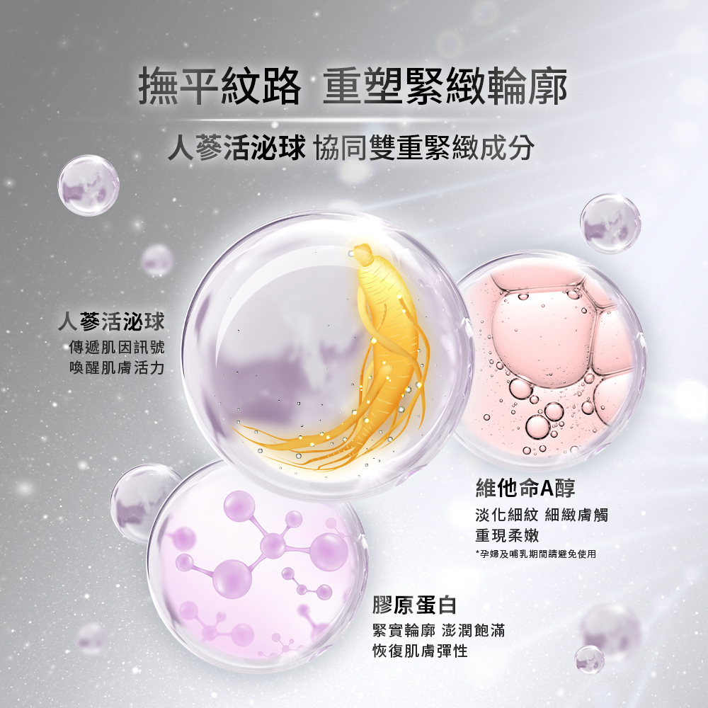 ◎人蔘活泌球,傳遞肌因訊號,喚醒肌膚活力。