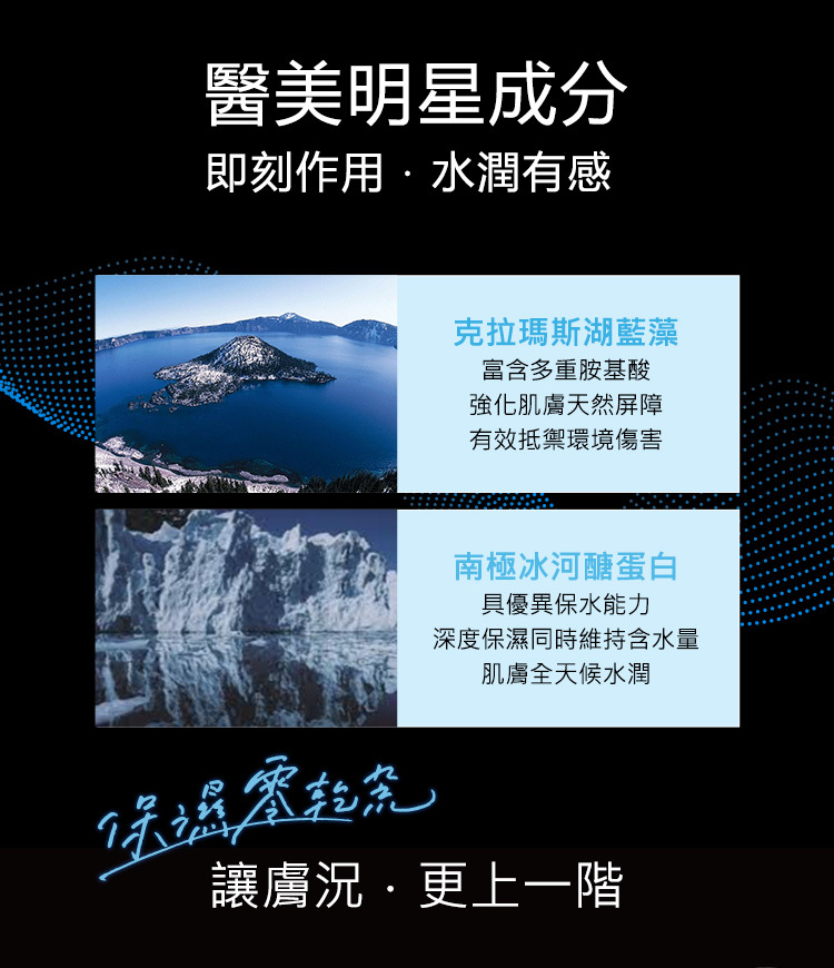 ◎ 克拉瑪斯湖藍藻+南極冰河醣蛋白,高效保濕水潤不間斷